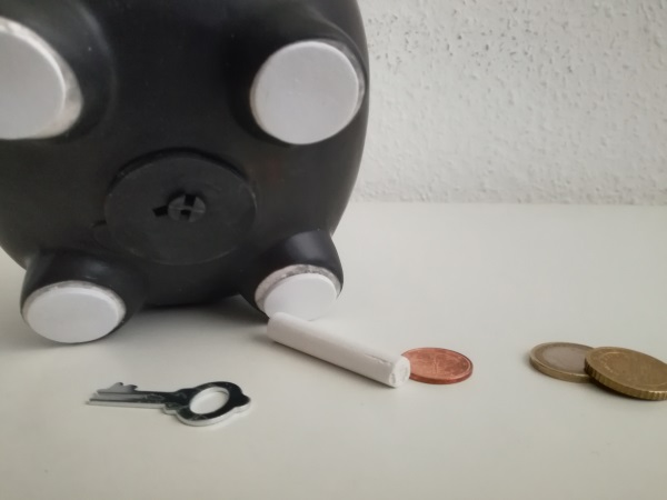 Der Deckel lässt sich einfach abdrehen, so dass man jederzeit bequem an das ersparte Geld kommt oder auf diese Weise den Betrag eingeworfener Geldscheine hinzufügen kann.